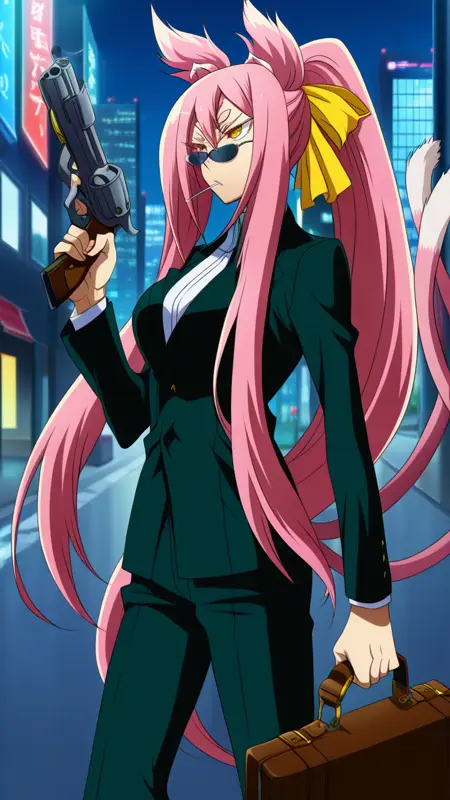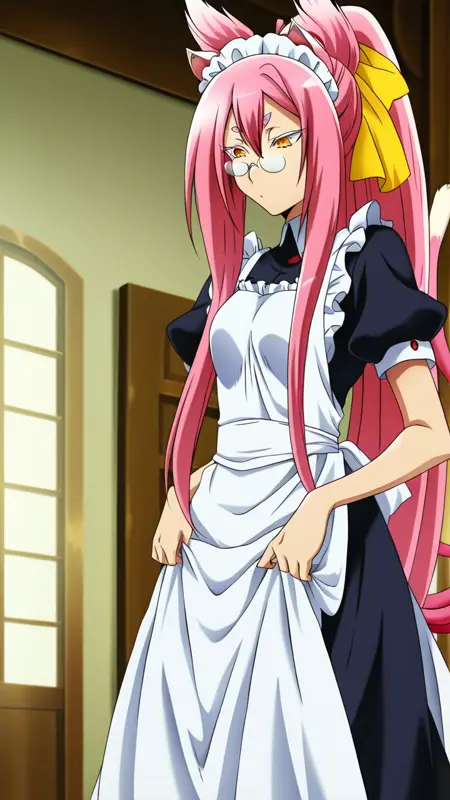 kokonoe (blazblue), 动物耳朵, 粉色头发, 长发, 猫耳, 猫尾, 眼睛间的头发, 发带, 超长发, 双尾, 黄色眼睛, 黄色发带, 眼镜, 多条尾巴, 直发, 马尾, 动物耳朵绒毛, 短眉毛, 侧发, 睫毛,