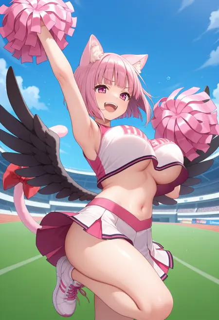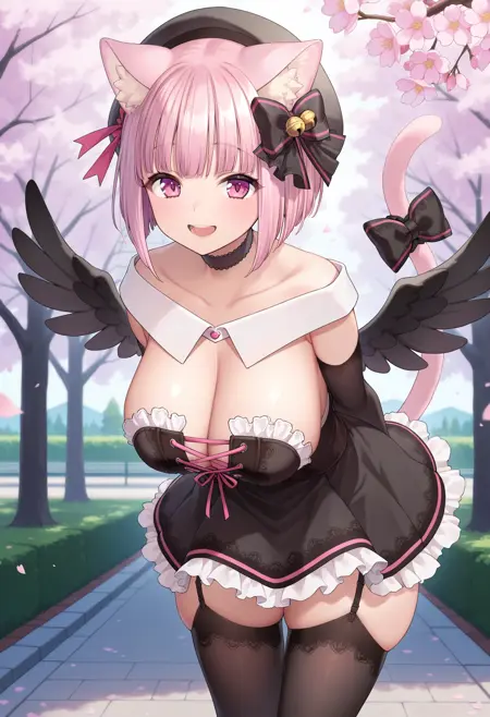 outfit2bbhimeno, short hair, pink hair, animal ears, beret, black headwear, hair bow, black bow, hair bell, pink eyes, black wings, large breasts, tail bow, black choker, off shoulder, black dress, elbow gloves, black gloves, garter straps, black thighhighs