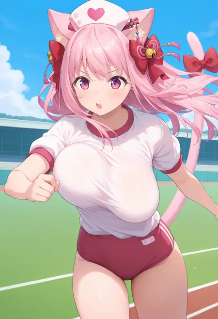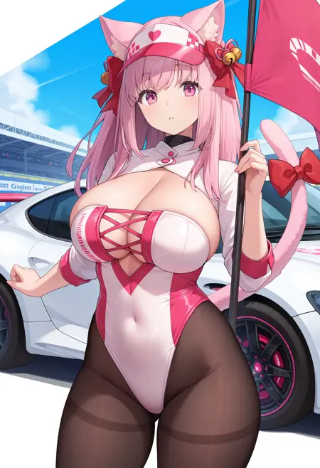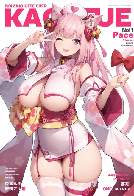 outfit1aahimeno, long hair, pink hair, animal ears, nurse cap, hair bow, red bow, hair bell, pink eyes, large breasts, tail bow, neck bell, floral print, white kimono, underboob, detached sleeves, obi, white skirt, garter straps, thigh strap, white thighhighs