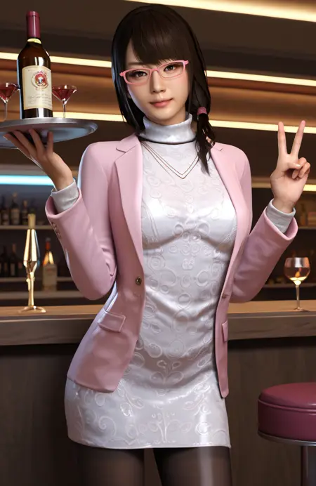 옷: 분홍 재킷, 흰 드레스, 검은 팬티스타킹,