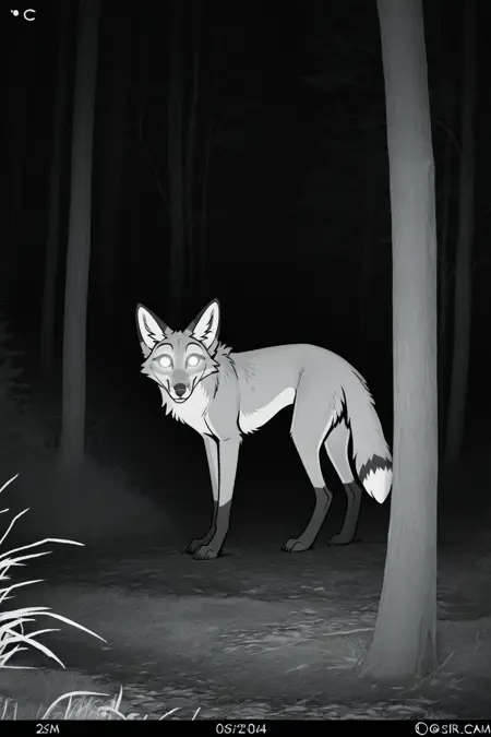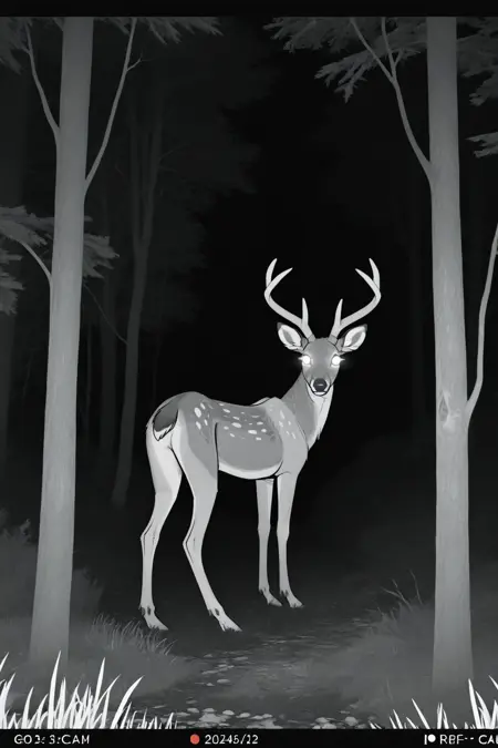 建议添加:夜间、黑暗、森林、草地、胶片颗粒、发光的眼睛,