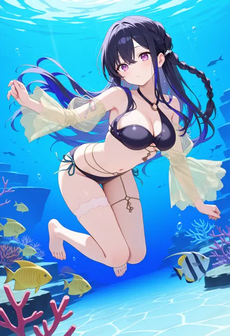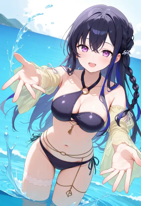 ffuruha, long hair, multicolored hair, black hair, single braid, purple eyes, medium breasts, halterneck, cleavage, o-ring bikini, black bikini, detached sleeves, see-through sleeves, belly chain, side-tie bikini bottom, thigh strap