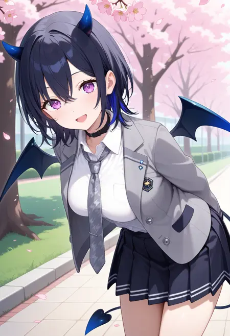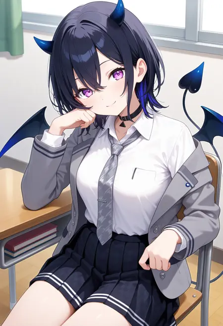 eeuruha, short hair, multicolored hair, black hair, demon horns, purple eyes, medium breasts, demon wings, demon tail, black choker, school uniform, grey necktie, collared shirt, white shirt, grey jacket, open jacket, long sleeves, pleated skirt, black skirt
