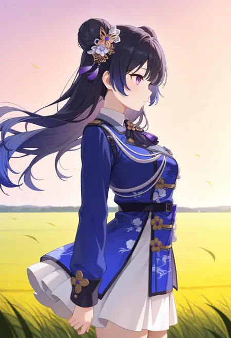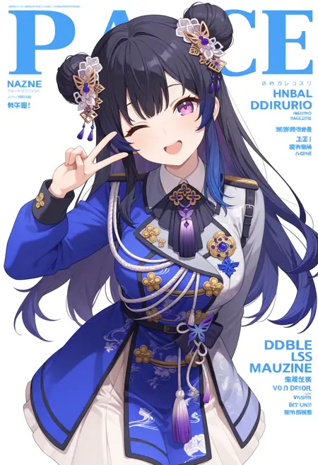 dduruha, long hair, multicolored hair, black hair, double bun, hair ornament, purple eyes, medium breasts, black ascot, aiguillette, collared dress, multicolored dress, long sleeves, white skirt