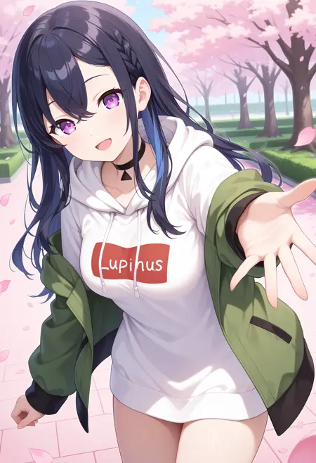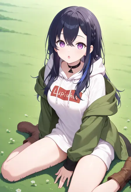aauruha, long hair, multicolored hair, black hair, braided bangs, purple eyes, medium breasts, black choker, white hoodie, clothes writing, off shoulder, green jacket, open jacket, long sleeves, bare legs