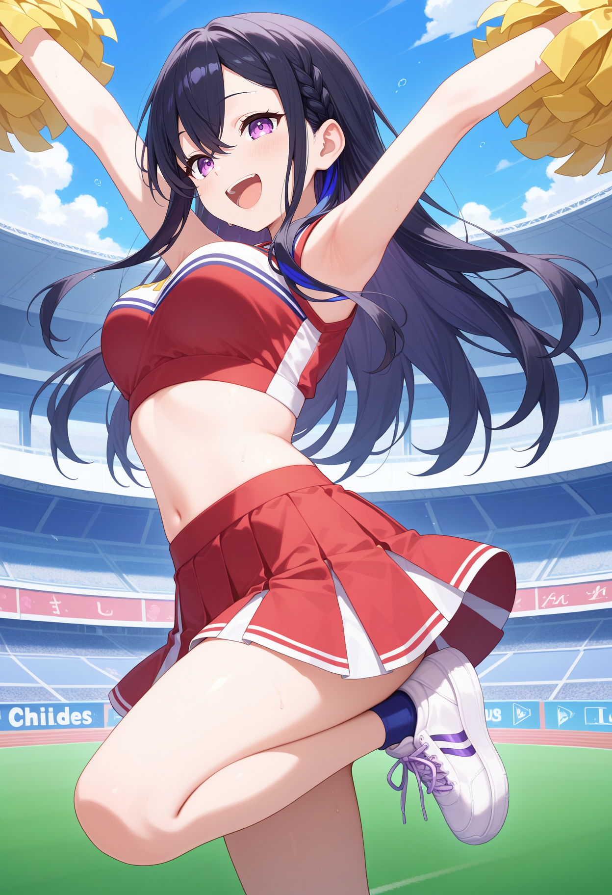 bburuha, long hair, multicolored hair, black hair, sidelocks, purple eyes, medium breasts, crop top, collared shirt, white shirt, sleeveless, fur-trimmed jacket, black jacket, long sleeves, suspenders, pleated skirt, black skirt