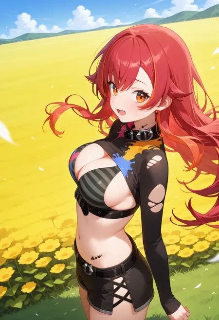 aatsuna, 长发, 多色发, 红发, 橙色眼睛, 尖牙, 黑色项圈, 露乳, 条纹比基尼, 紧身衬衫, 破损衬衫, 黑色衬衫, 长袖, 腹部纹身, 露腹, 腰带, 黑色短裤, 侧开衩