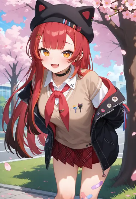 ddtsuna, 长发, 多色发, 红发, 动物帽, 黑色头饰, 发饰, 穿孔, 尖牙, 黑色项圈, 校服, 红色领巾, 有领衬衫, 白色衬衫, 棕色马甲, 露肩, 黑色夹克, 长袖, 格子裙, 红色裙子, 腿部贴创可贴