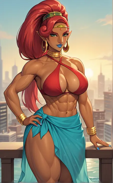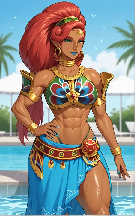 RedBikini_Urbosa_ownwaifu, 1girl, bare shoulders, big hair, blue lips, blue nails, circlet, collarbone, dark-skinned female, green eyes, hair pulled back, halterneck, hoop earrings, jewelry, lipstick, long nose, makeup, muscular female, nail polish, neck ring, pointy ears, pointy nose, red hair, tall female, thick eyebrows, toned, urbosa, very dark skin, abs, biceps, bracelet, cleavage, criss-cross halter, large breasts, navel, obliques, high ponytail, ponytail, veins, sarong, green sarong, red swimsuit, thick thighs,