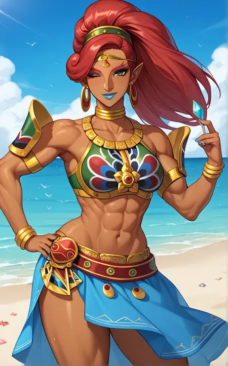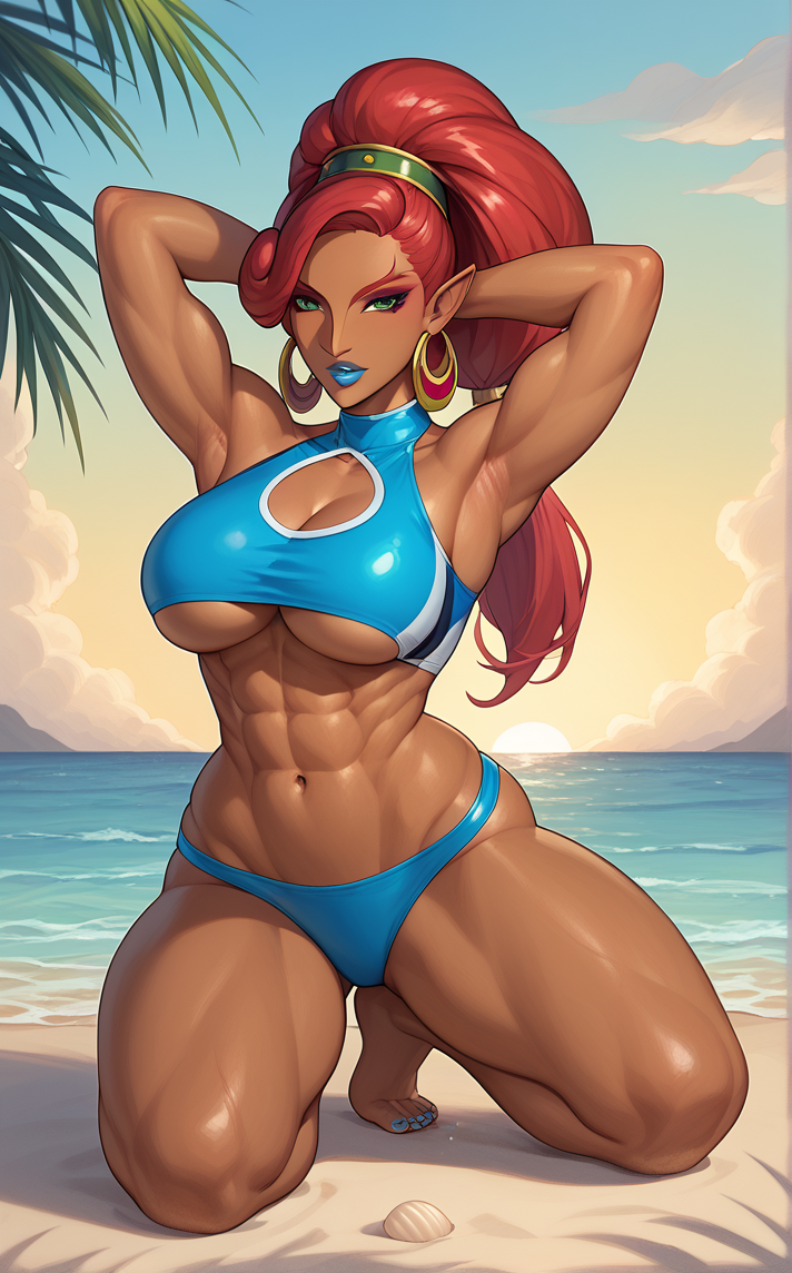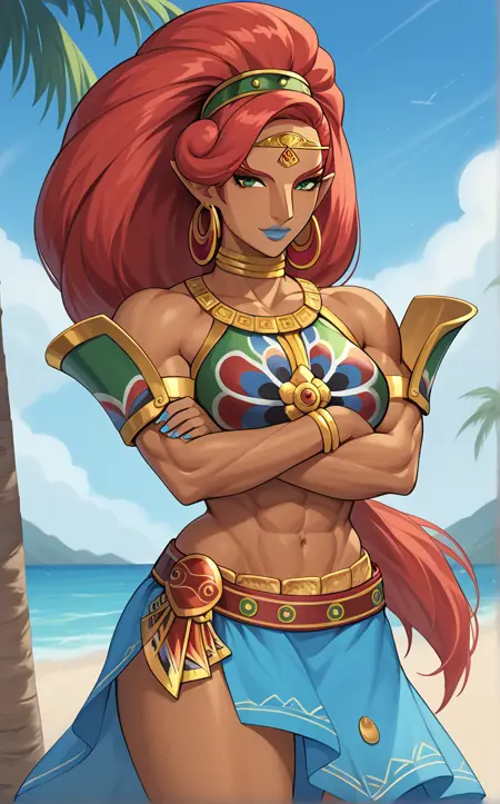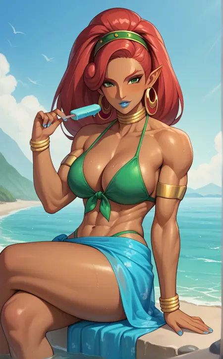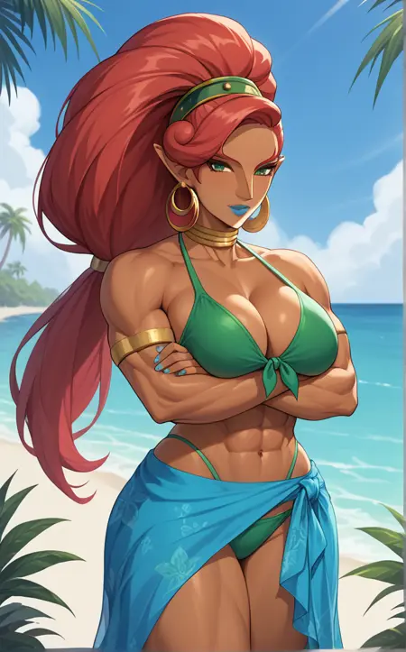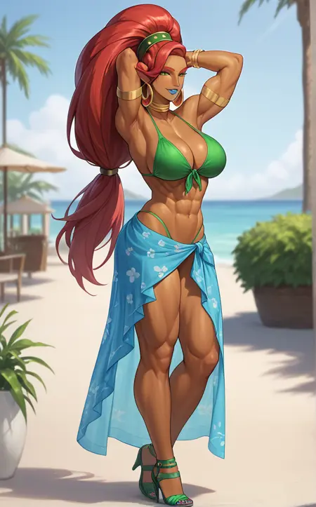 SarongBikini_Urbosa_ownwaifu, 1girl, bare shoulders, big hair, blue lips, blue sarong, collarbone, dark-skinned female, green bikini, green eyes, hair pulled back, hoop earrings, jewelry, lipstick, long nose, makeup, neck ring, pointy ears, pointy nose, red hair, sarong, swept bangs, swimsuit, tall female, thick eyebrows, toned, urbosa, very dark skin, abs, armlet, blue nails, cleavage, front-tie bikini top, front-tie top, hairband, high ponytail, highleg bikini, large breasts, muscular female, nail polish, navel, obliques, biceps, bikini, thick thighs,