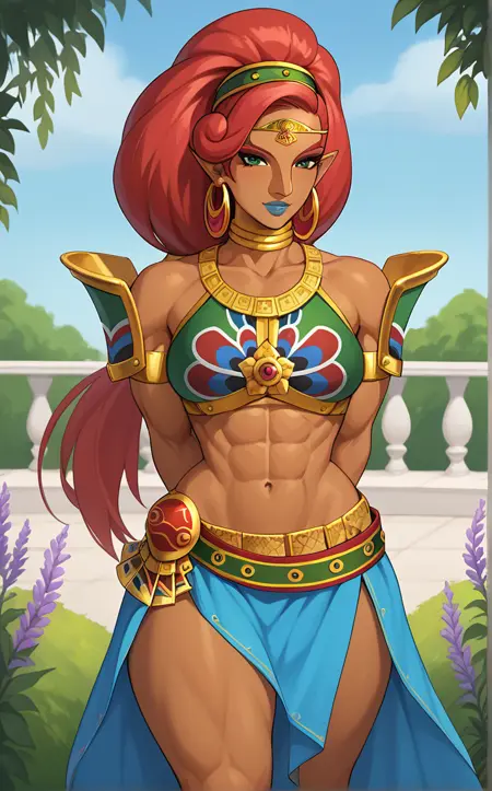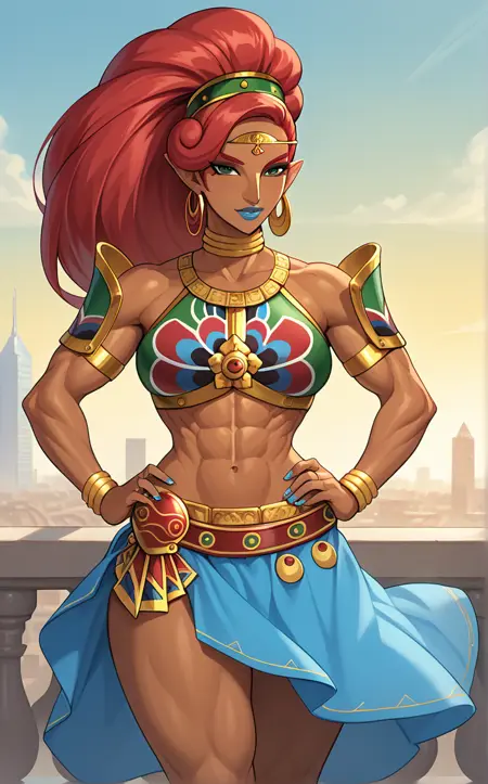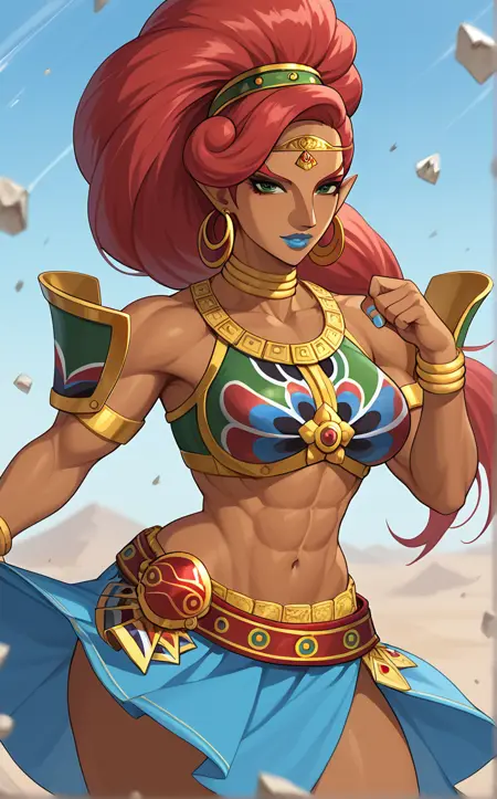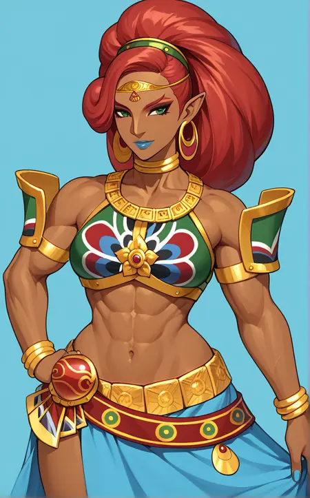 MAIN_Urbosa_ownwaifu, 1girl, big hair, jewelry, lipstick, pointy ears, pointy nose, tall female, thick eyebrows, toned, urbosa, very dark skin, dark-skinned female, makeup, blue lips, hair pulled back, hoop earrings, neck ring, circlet, red hair, green eyes, breastplate, shoulder armor, armlet, muscular female, midriff, bracelet, pauldrons, navel, abs, eyeshadow, long nose, bare shoulders, nail polish, blue nails, crop top, high ponytail, obliques, swept bangs, collarbone, hairband, blue skirt, long skirt, large breasts, necklace, narrow waist, colored skin, thick thighs, wide hips, biceps, hair ornament, sarong, thighs, bikini armor, bangle, side slit, eyelashes, choker, afro, gem, green hairband, belt, eyeliner, forehead jewel, gold earrings, arabian clothes,