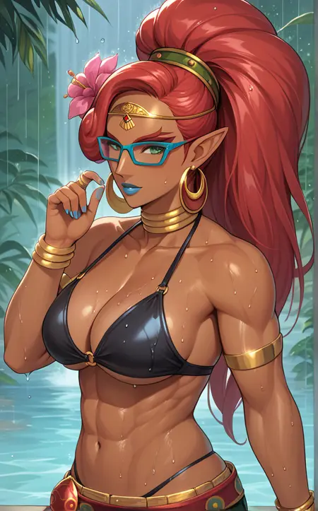 BlackBikini_Urbosa_ownwaifu, 1girl, bangle, bare shoulders, big hair, blue lips, blue nails, choker, dark-skinned female, glasses, green eyes, hair flower, hair ornament, hair pulled back, hoop earrings, jewelry, lipstick, makeup, nail polish, neck ring, pink flower, pointy ears, pointy nose, red hair, swept bangs, tall female, thick eyebrows, toned, urbosa, very dark skin, abs, armlet, bespectacled, blue-framed eyewear, bracelet, circlet, hairband, large breasts, muscular female, navel, ponytail, black bikini, blue eyeshadow, cleavage, collarbone, glint, gold bracelet, gold earrings, thighs,