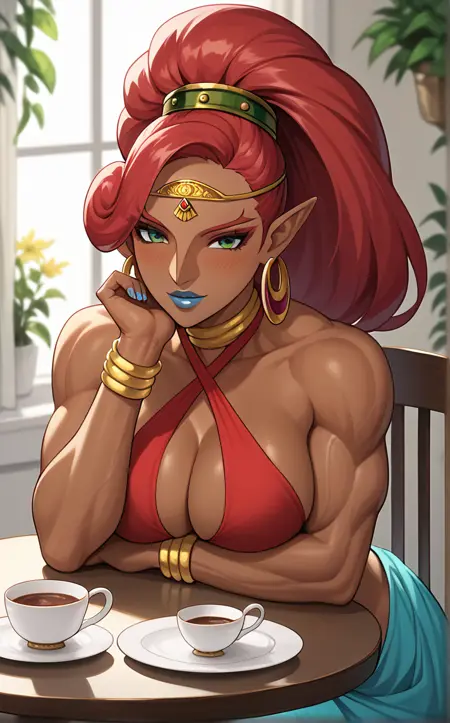 NSFW_Urbosa_ownwaifu, 1girl, big hair, dark-skinned female, hair pulled back, jewelry, makeup, nipples, nude, pointy nose, tall female, thick eyebrows, toned, urbosa, very dark skin, pointy ears, blue lips, hoop earrings, muscular female, dark nipples, long nose, lipstick, green eyes, large breasts, neck ring, circlet, abs, red hair, bracelet, navel, completely nude, thick thighs, eyeshadow, blue nails, nail polish, obliques, pussy, armlet, dark areolae, high ponytail, biceps, bangle, curvy, wide hips, collarbone, swept bangs, narrow waist, colored skin, aqua nails,