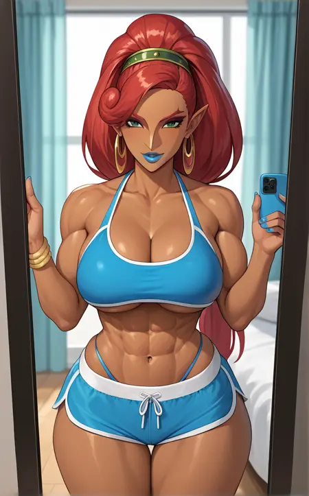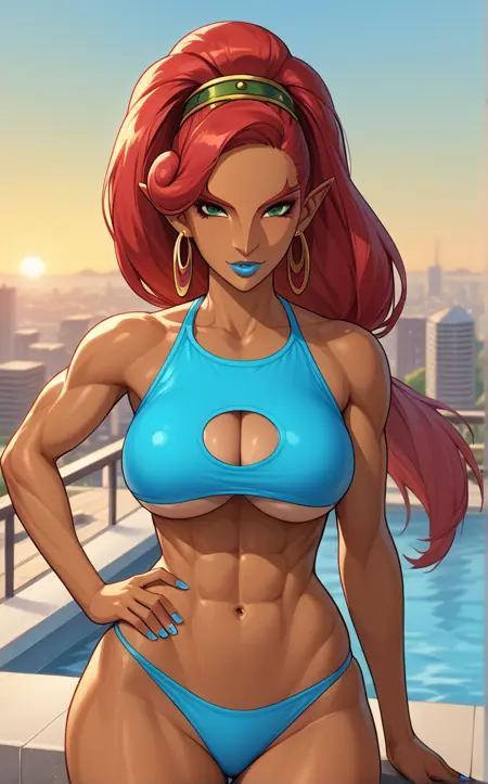 BlueSwimsuit_Urbosa_ownwaifu, 1girl, big hair, blue lips, collarbone, dark-skinned female, green eyes, hair pulled back, hairband, high ponytail, hoop earrings, jewelry, lipstick, makeup, pointy ears, pointy nose, red hair, tall female, thick eyebrows, toned, urbosa, very dark skin, abs, blue bikini, cleavage cutout, clothing cutout, eyeshadow, large breasts, muscular female, navel, swept bangs, swimsuit, tankini, underboob, bare shoulders, blue nails, crop top, midriff, nail polish, obliques, thick thighs, wide hips,