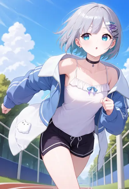outfit4ddsumire, short hair, multicolored hair, grey hair, hairclip, earrings, blue eyes, black choker, white camisole, off shoulder, two-tone jacket, blue jacket, open jacket, long sleeves, short shorts, black shorts
