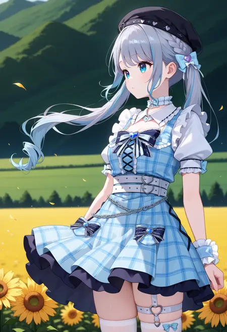 outfit5eesumire, long hair, multicolored hair, grey hair, twintails, braid, hair bow, beret, black headwear, blue eyes, frilled choker, detached collar, black bowtie, plaid dress, blue dress, short sleeves, wrist cuffs, blue bow, white belt, thigh strap, white thighhighs,