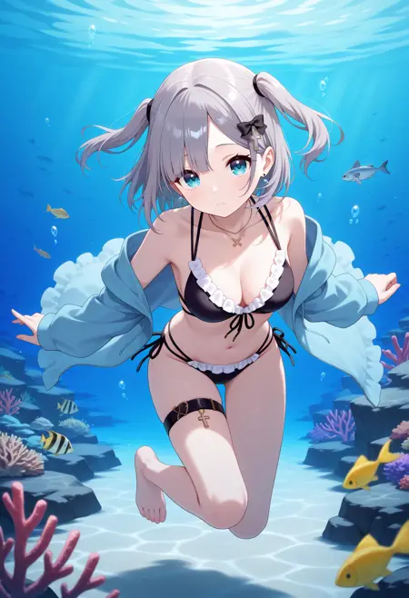 outfit3ccsumire, short hair, grey hair, two side up, hair bow, cross hair ornament, earrings, blue eyes, necklace, frilled bikini, black bikini, off shoulder, long sleeves, blue jacket, open jacket, thigh strap