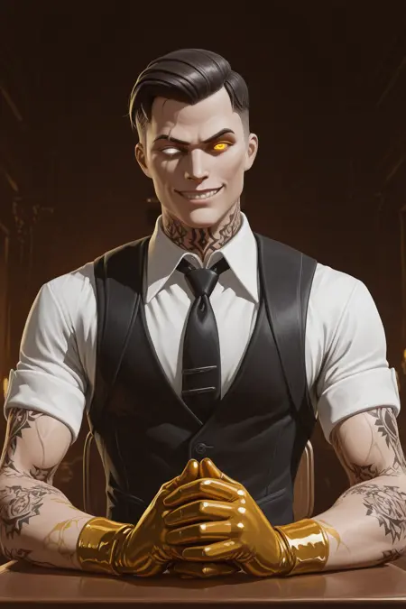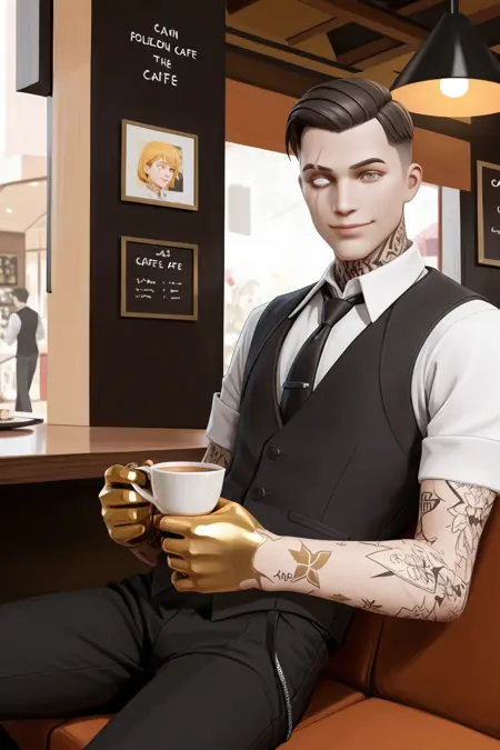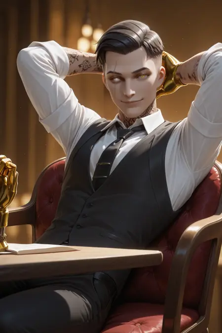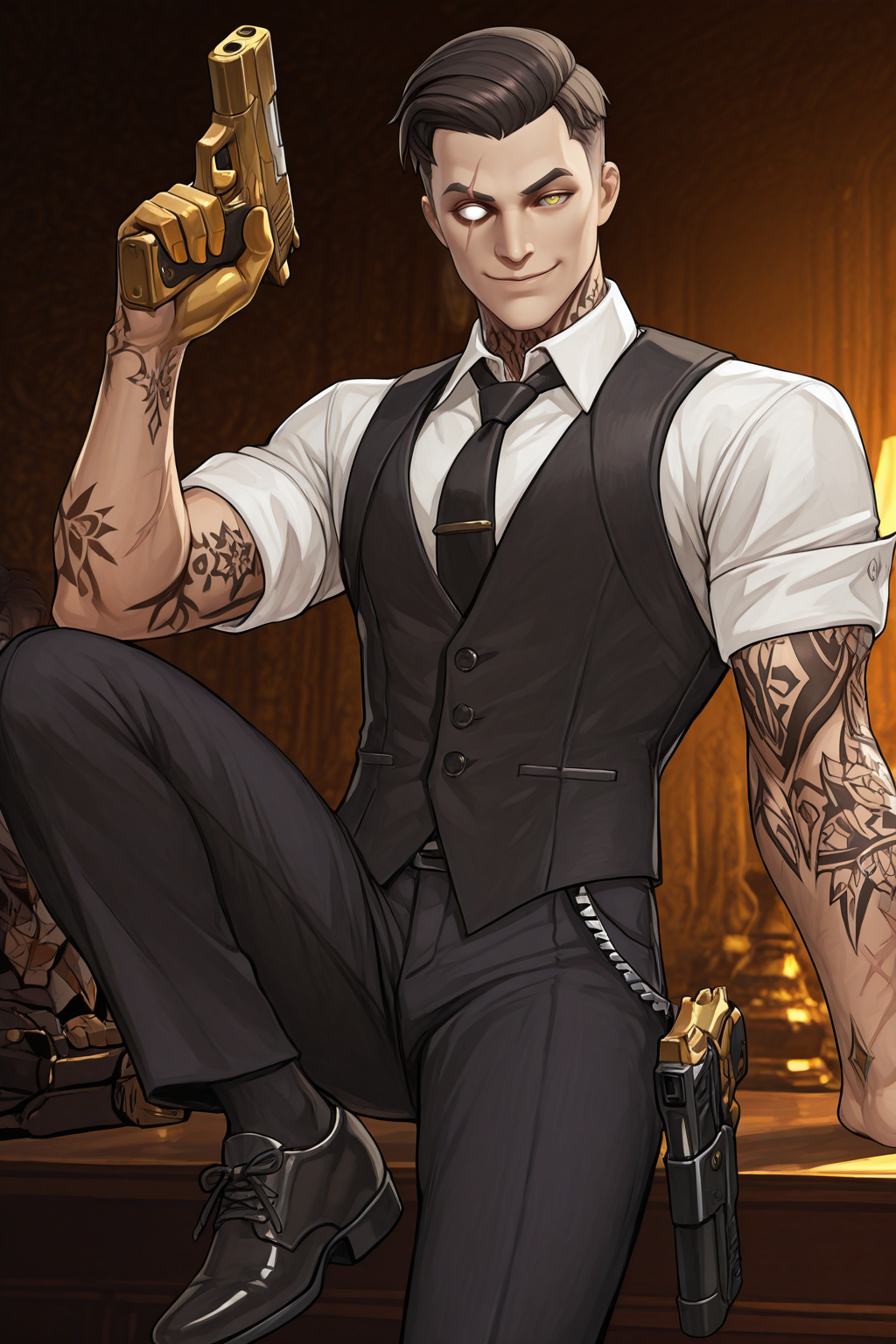 Trigger : mds, short hair, undercut, scar over eye, single white eye, heterochromia, collared shirt, tattoo, necktie, black vest, golden hands, colored skin, goldon gloves, arm tattoo, pants, shoes