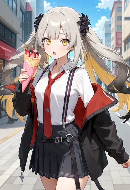 aaalter, long hair, multicolored hair, grey hair, twintails, hair flower, black flower, yellow eyes, small breasts, red necktie, collared shirt, white shirt, suspenders, off shoulder, black jacket, long sleeves, black belt, pleated skirt, black skirt