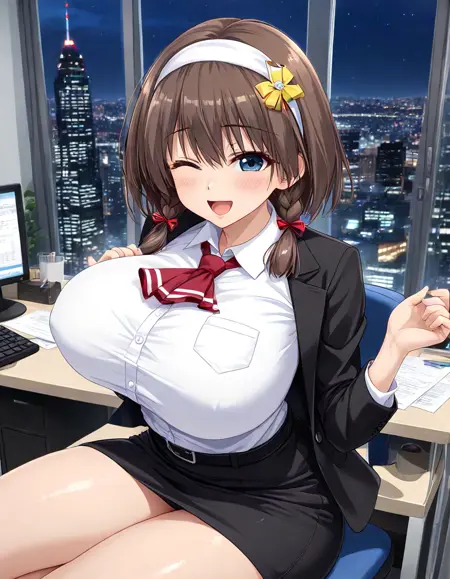 Recommend Prompt:Ema Matsufusa, large breasts, blue eyes, brown hair, short hair, twin braids, hairband,