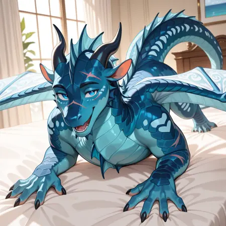 附加提示词:Seawing_wof, dragon, scales, horns, claws, wings, tail, aquatic scales, blue eyes, 1girl, chin tendrils, head frill, chest frill, webbed claws, webbed feet