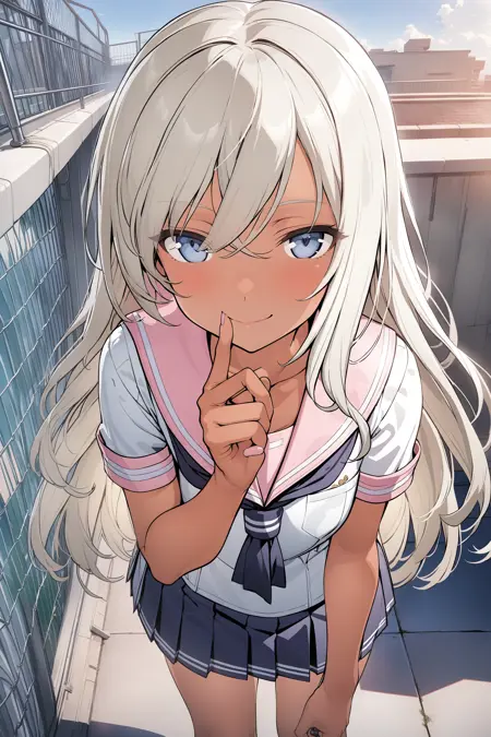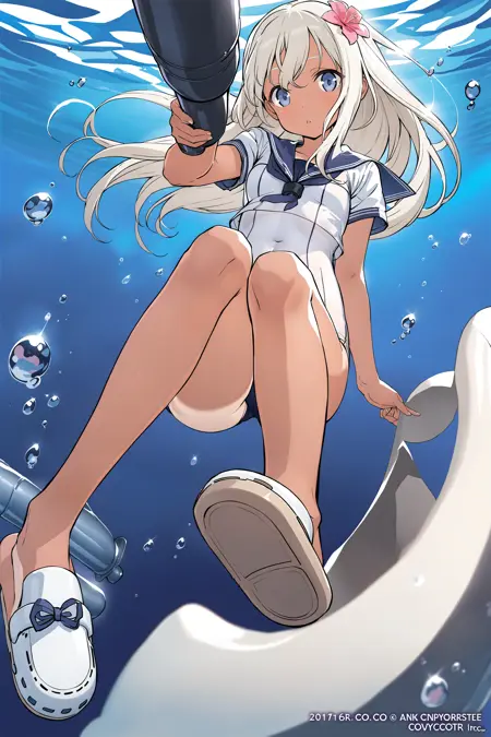 def: 学校制服、セーラー襟、クロップドトップ、学校水着、ワンピース日焼け、日焼け跡、服の下の水着、スリッパ、
