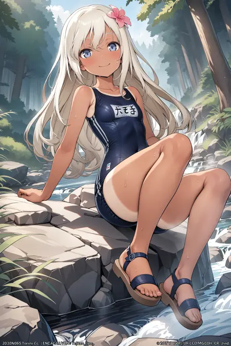 def-: 学校水着、裸足、ワンピース日焼け、日焼け跡