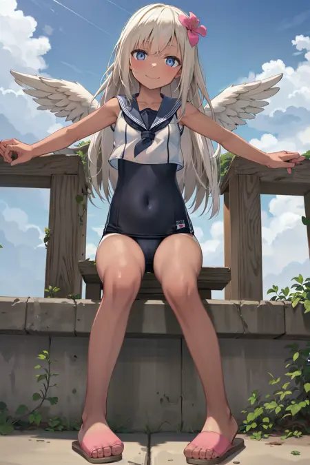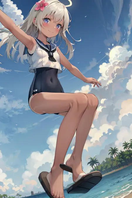 def: school uniform, sailor collar, crop top, school swimsuit, one-piece tan, tanlines, swimsuit under clothes, slippers,