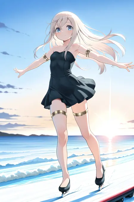 インナー: ガーリソン帽、黒いドレス、ショートドレス、ストラップレスドレス、肩出し、足出し、裸足、腕輪、太もも用の装飾、