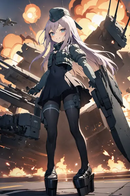 def: 军装,军帽,短款夹克,泡泡袖,长袖,手套,黑色连衣裙,黑色连裤袜,厚底鞋,
