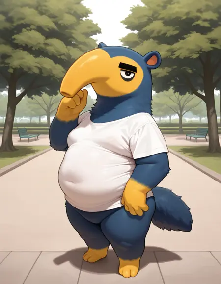 CyranoAC, male, chubby, anteater, blue fur, yellow face, big black eyebrows, bushy tail, yellow hands, yellow feet