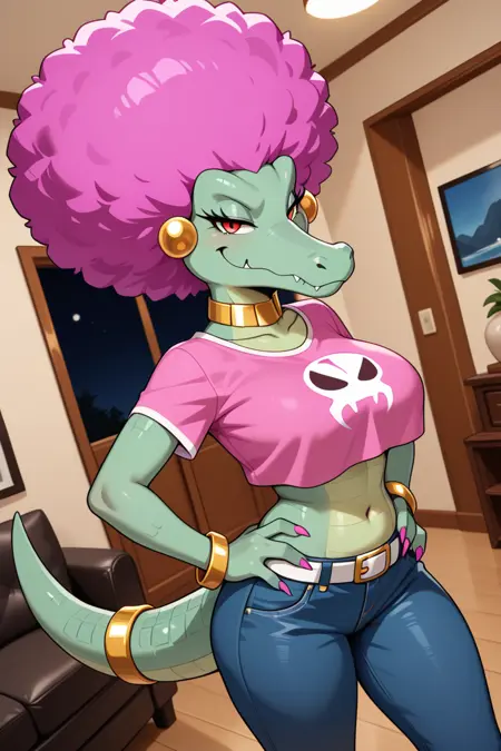 Tags: Kalypso, anthro, furry female, afro, pink hair, crocodilian, crocodilian tail, red eyes,