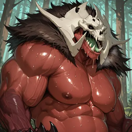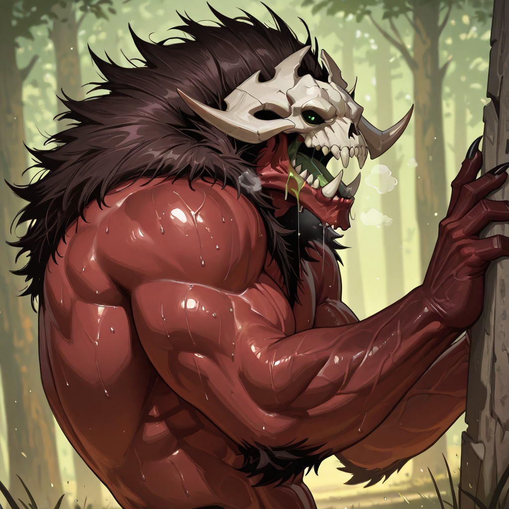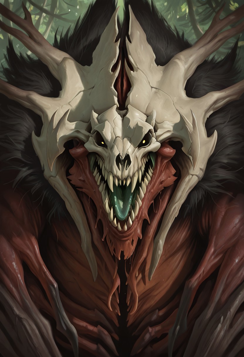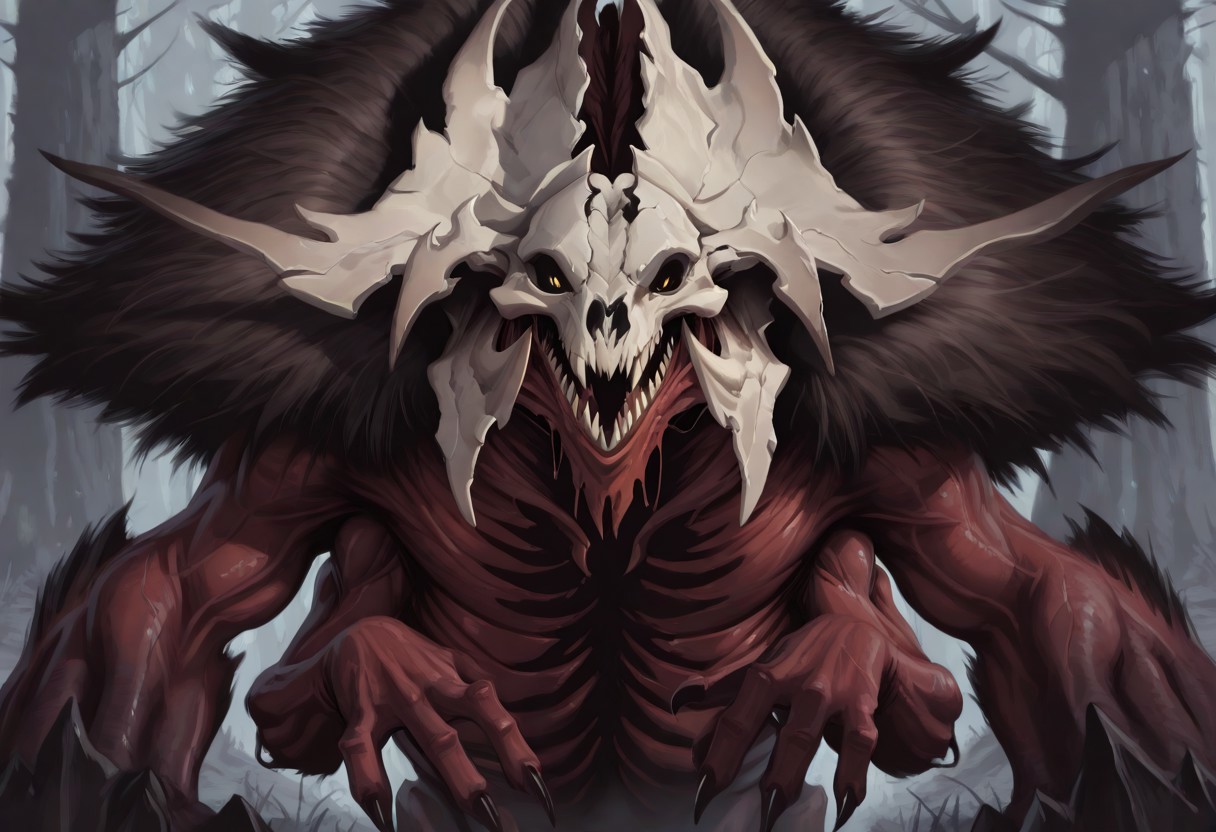 タグ:フェイクセイアン、ピンクがかった赤い肌、とげのあるツノ、頭蓋骨のような顔、モンスター、鋭い牙、不規則な毛並み、肋骨が見える、鋭い歯、爪、ファンタジー生物、筋肉質、肩の毛、複数の腕