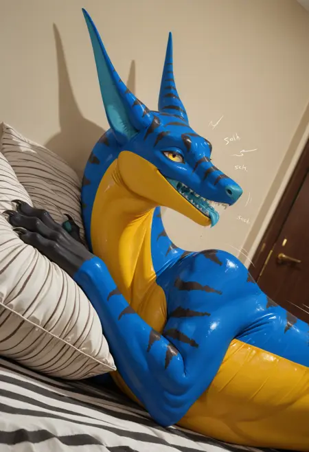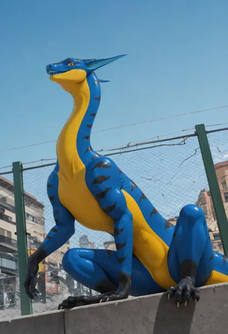 sof1a_drag0ness, solo, 1girl, dog nose, no humans, feral, dragon, smooth skin, animal focus, bent, yellow eyes, blue body, black stripes, yellow belly, digitigrade, (nose, mammal nose:1.1), two-tone body, black paws, white claws