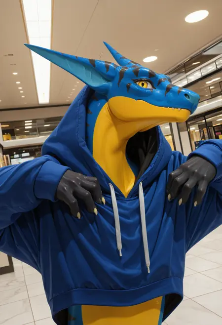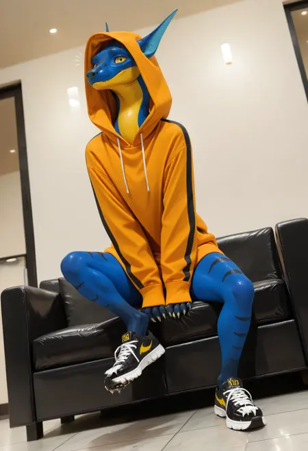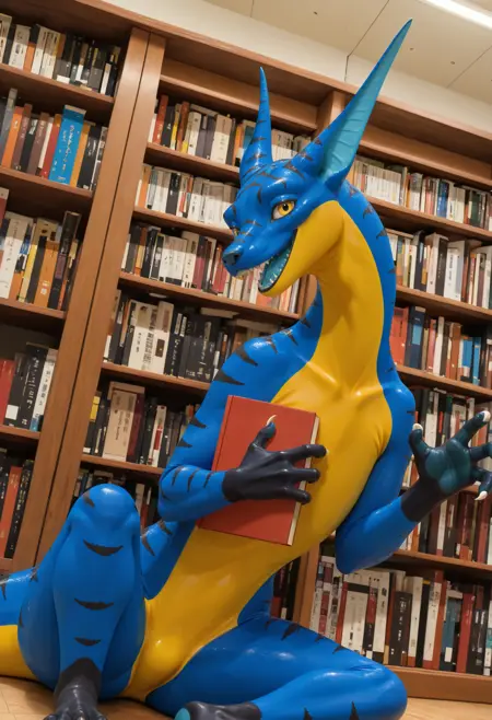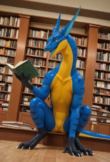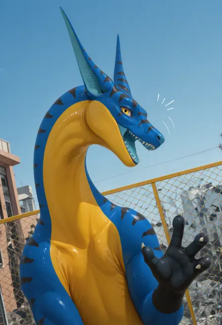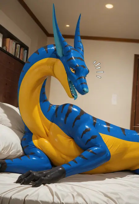 📝 София Драконица — морской дракон с гладкой синей кожей, жёлтым животом и чёрными полосами на спине. У неё длинная, изогнутая шея, заострённые уши и выразительные янтарные глаза. Лапы сильные, с когтистыми пальцами, а тело гибкое и обтекаемое..