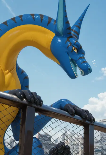 📝 드래곤녀 소피아는 매끄러운 푸른 피부, 노란 배, 등에 검은 줄무늬가 있는 바다 드래곤입니다. 길고 곡선을 이룬 목, 뾰족한 귀, 인상적인 옥색 눈을 지니고 있으며, 코는 어두운 색상으로, 검은 줄무늬와 조화를 이룹니다. 다리는 강력하고 발톱이 있으며, 몸은 유연하고 유선형입니다.