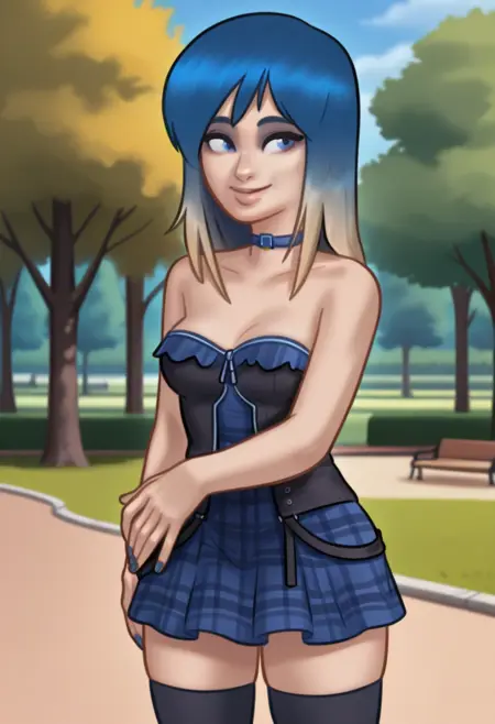 옷차림 - 파란 목걸이, 파란 드레스, 스트랩리스 드레스, 체크 스커트, 검은 허벅지 스타킹, 무릎 위 스타킹