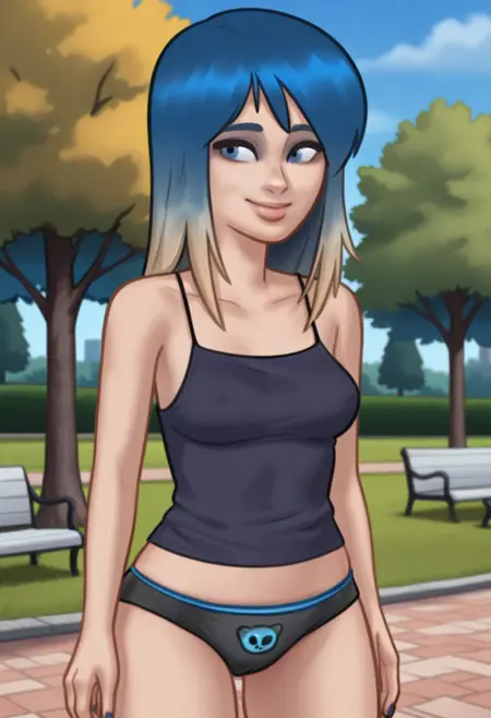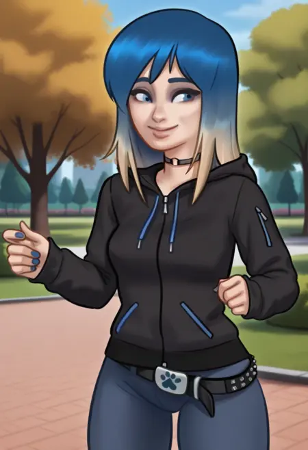 옷차림 - 검은 벨트, 파란 바지 (위의 옷차림 중 하나에 추가하세요. 이는 두 옷을 함께 입고 있는 그녀의 모습입니다)