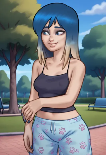 옷차림 - 파란 파자마, 발가락 무늬 (그녀는 이 파자마를 검은 카미솔 아래 또는 상의 없이 입습니다)