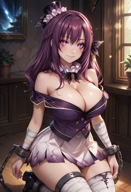 Default Astral Dress: off shoulder, cleavage, mini top hat, hair ornament, chain, shackles, white underskirt, skirt, purple jacket, dress, bandages, bandaged arm, bandaged leg, detached collar, frilled choker, frills, black footwear, zettai ryouiki, thighlet
