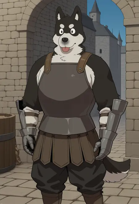 主要服装:黑色长裤、胸甲、护臂、pteruges