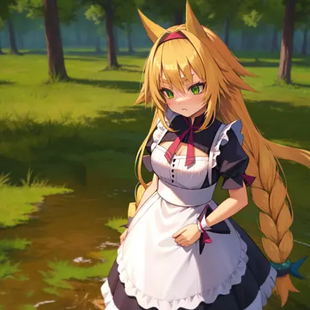标签为: metallia, 动物耳朵, 双马尾, 长发, 金发, 绿眼, 帽子, 女巫帽, 尖牙。