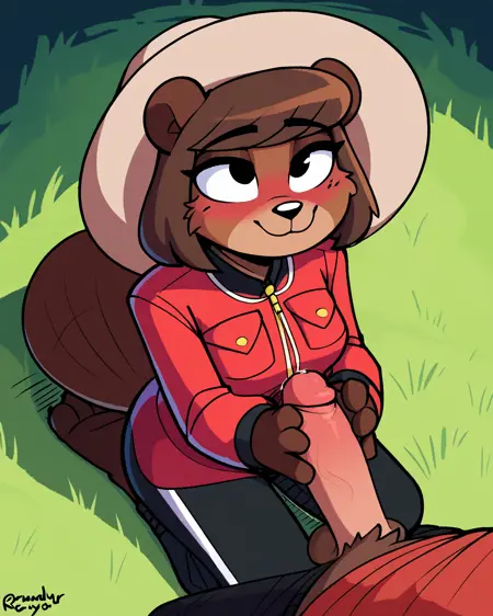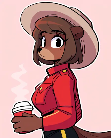 Triggers: furry female, female, beaver, furry, black eyes, brown hair, short hair, tail, hat, medium breasts, red jacket, black pants