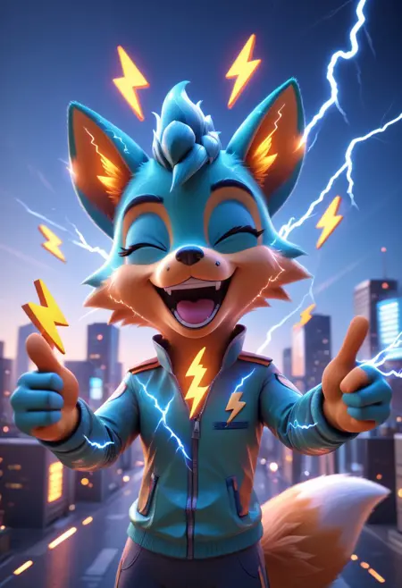 Examples: (tiny/small) stylized lightning bolt symbols, electricity, electric, lightning, lightning bolts, electric energy, glowing, bright, power, sparks, glowing sparks, the word "BUZZ", orange, blue, 3D - And combinations of them.