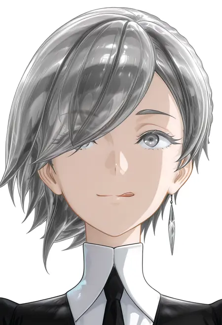 Goshenite/Cnn, 1girl, colored eyelashes, grey hair, grey eyes, short hair, hair over one eye,
