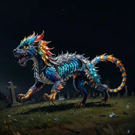 長いプロンプトでは、埋め込みは依然としてプロンプトのメイン対象を変化させ、設定にも部分的に影響します。周囲に角張った宝石を散らす傾向があります。テストでは、長いプロンプトでクリスタル効果がより不透明で金属的に、時には羽のように見えることもありました。