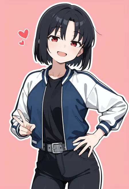 검은 머리, 단발, 빨간 눈, 다색 자켓, 흰 자켓, 파란 자켓, 검은 셔츠, 회색 벨트, 검은 바지,