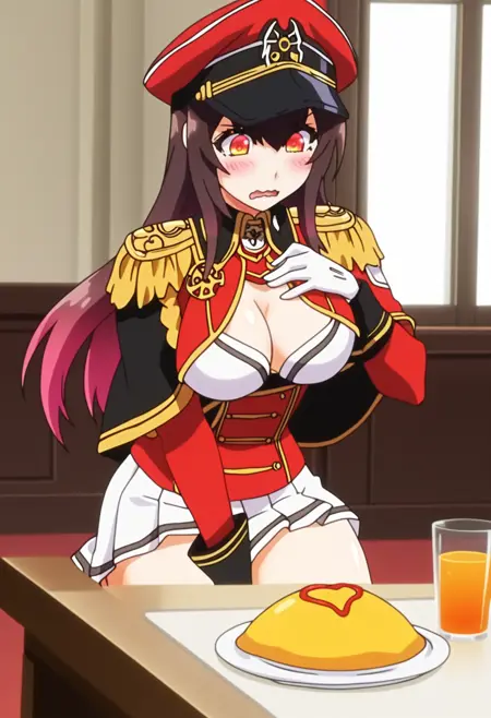 military uniform, red corset, double breasted, cleavage, red shrug \(clothing\), long sleeves, epaulettes, aiguillette, white gloves, black capelet, white pleated miniskirt, black see-through thighhighs, red peaked cap, white thigh boots, lace-up boots, high heels