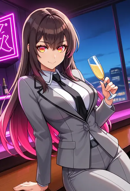 svmichael, 1girl, gradient hair, brown hair, pink hair, gradient eyes, red eyes, yellow eyes, long hair