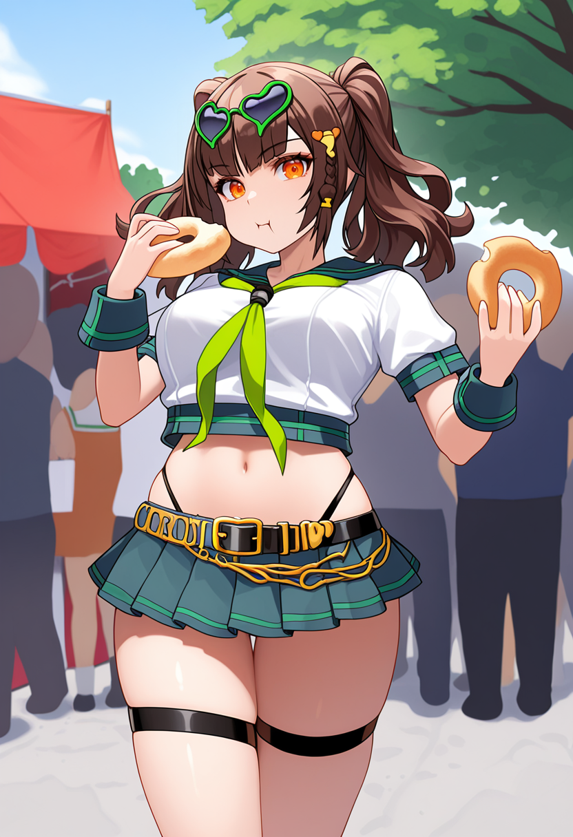 serafuku, white shirt, short sleeves, green sailor collar, light green neckerchief, crop top, navel, green pleated miniskirt, black belt, gold belt buckle, black highleg panties, green wrist cuffs, black thigh strap, black thigh leash, sunglasses, green-framed eyewear, eyewear on head, heart-shaped eyewear, ice cream hair ornament, white kneehighs, black flats